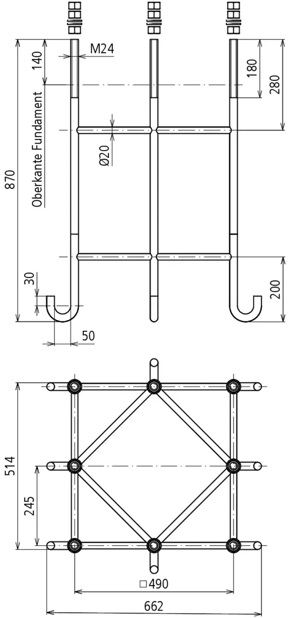 | Ausführung Gewindebolzen | 8x M24 (490 x 490 mm) |