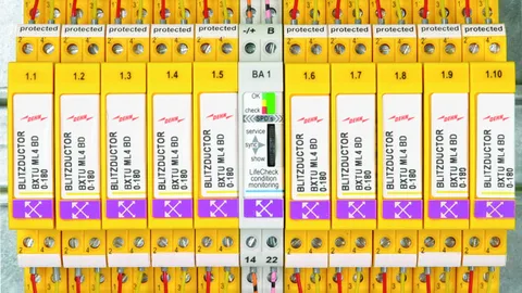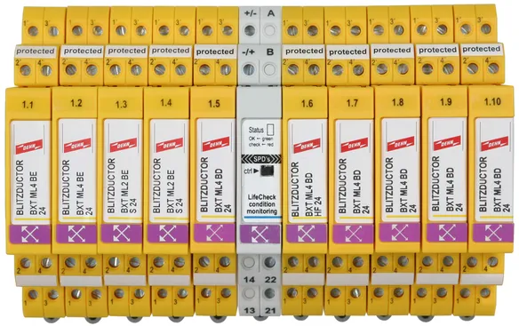 Hutschienengerät mit integriertem RFID-LifeCheck-Sensor für die zustandsorientierte Überwachung von max. 10 BLITZDUCTOR XT/XTU mit RFID-LifeCheck. Optische Ableiter-Zustandsmeldung über 3-Farben-LED kombiniert mit FM-Signalisierung (Öffner oder Schließer). Über die integrierte RS485-Schnittstelle können bis zu 15 DRC MCM XT in einem System mit bis zu 150 BLITZDUCTOR XT/XTU Ableiter überwacht werden.