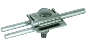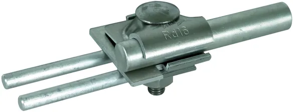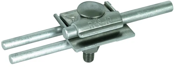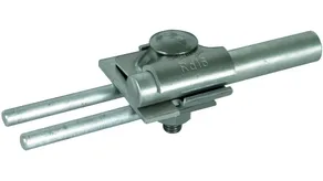 FangStangenklemme zum Verbinden von Fangstangen / -spitzen mit einer oder zwei Leitungen; bei zwei Anschlussleitungen bessere Aufteilung des Blitzstromes und somit eine Reduzierung des Trennungsabstandes mit spezieller Druckscheibe für den Anschluss längs und quer.