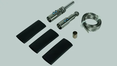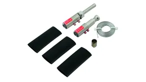 Anschlussset zum Abschließen der HVI light Leitung an beiden Enden, beim Erstellen des Anpassungsbereiches der Leitung im Stützrohr (Kopfstück) und Anschlusselement zum Anschließen an andere Teile des äußeren Blitzschutzes oder der Erdungsanlage (inkl. PA-Anschlussleitung, Kontaktrollfeder und drei Schrumpfschläuche).