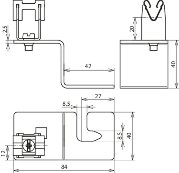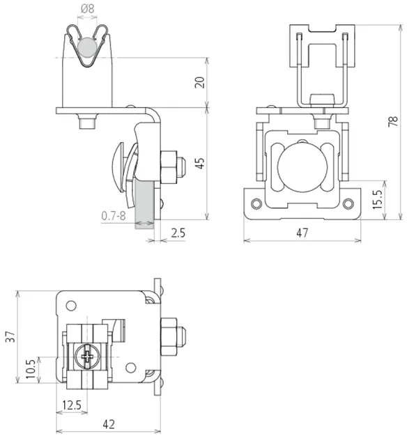 Roof conductor holder for metal roofs for fixing additional air-termination systems or conductors on metal roofs (e.g. Part No. 123 021).