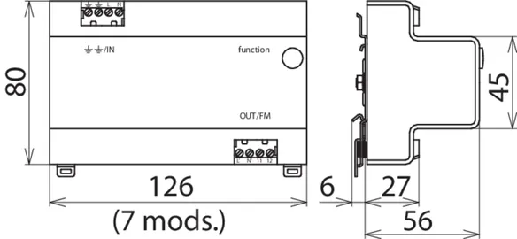 - Visual operating state indication (green) and floating remote signalling contact (break contact) for fault indication