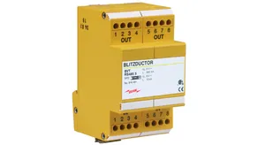 Energy coordinated combined arrester for protecting the voltage measuring circuit (yellow colour). Pluggable remote signalling contact (break contact) for overload indication (temperature monitoring of the discharge paths). Installation in sheet metal housing recommended. Low impulse sparkover voltage due to capacitive control.