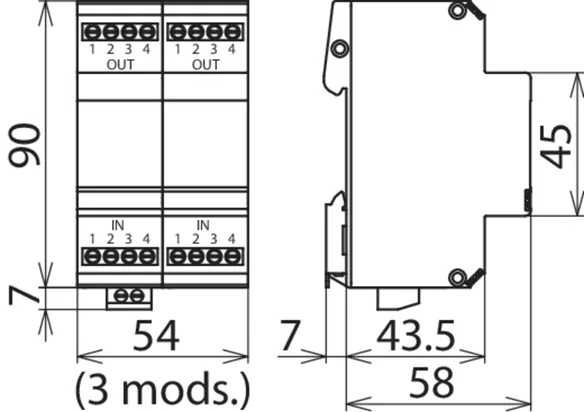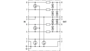 Energy-coordinated and leakage-current-free surge arrester for a/b lines, ISDN Uk0 or ADSL with RJ45 connections and additional screw terminals. Pinning of the RJ45 sockets is compatible with RJ11/12. The parallel screw terminals are more robust than the RJ45 sockets and increase the total nominal discharge current to 10 kA.