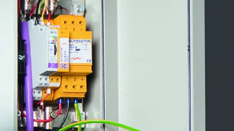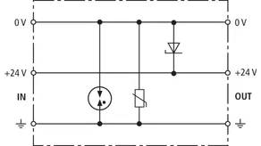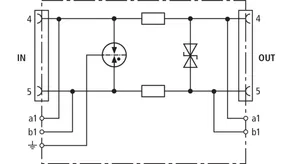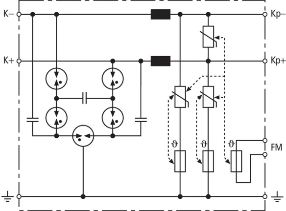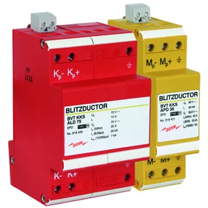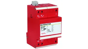 Energy coordinated combined arrester for protecting the rectifier in the protective circuit (red colour). Pluggable remote signalling contact (break contact) for overload indication (temperature monitoring of the varistors). Installation in sheet metal housing recommended. Low impulse sparkover voltage due to capacitive control.