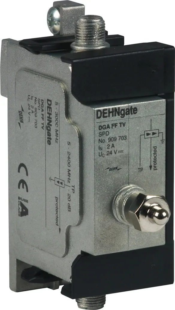 DGA ... TV arresters with F connection for remote supply protect 75-ohm satellite and broadband cable systems and fulfil the high shielding requirements of class A according to EN 50083-2. They allow space-saving installation in all common TV and satellite applications and are available as lightning current arresters, surge arresters and combined lightning current and surge arresters with integrated measuring output for checking the system.