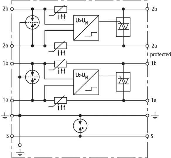 Space-saving, compact surge arrester in a surface-mounted plastic enclosure with push-in connection technology and status indication for protecting one pair of unearthed balanced interfaces, particularly telecommunication interfaces up to VVDSL and G.fast (up to 1 Gbit/s). Direct / indirect shield earthing possible. Connection of a pair or a patch cable with RJ45 plug at the output.