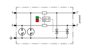 Space-saving, modular lightning current arrester with a width of 6 mm and push-in connection technology with status indication for protecting two single lines for lightning equipotential bonding as well as indirect earthing of shielded cables. With signal disconnection for maintenance purposes.