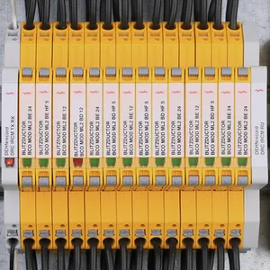 Condition monitoring unit DEHNrecord, set for DIN rail mounted devices with integrated visual transmitter/receiver and visual reverse BLITZDUCTORconnect arresters and DEHNpatch with LifeCheck. Visual arrester status indication via LED group display in combination with remote signalling contact (break contact).