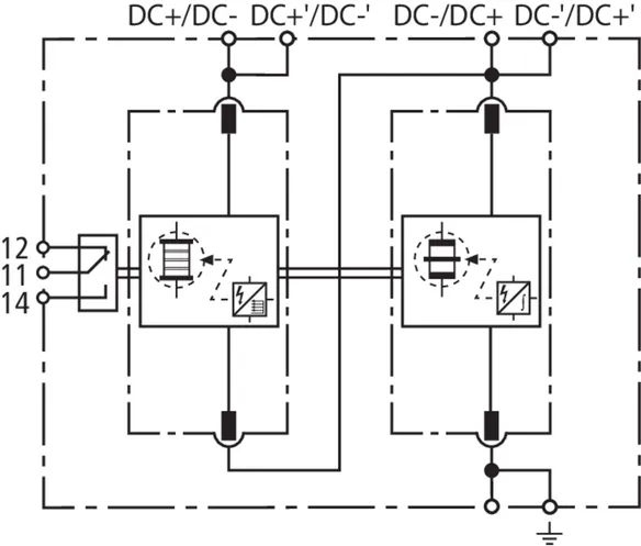 | Levezetési áramimpulzus (10/350 µs) (DC+/DC- -> DC-/DC+) / (DC-/DC+ -> 9) (Iimp ) | 25 / 50 kA |