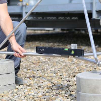 Eine Person allein kann das Stativ ins Wassermaß bringen. Die Wasserwaage wird dafür auf das Stativ gelegt. Der Monteur variiert durch ein einfaches Verschieben der Eckpunkte/ KS-Verbinder die Höhe und passt es dadurch an die jeweilige Dachneigung an.