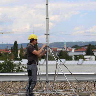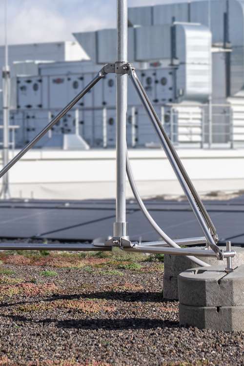 Zu den Komponenten des äußeren Blitzschutzes gehören unsere Drei- und Vierbeinstative für Fangstangen und Stützrohre. Sie sind schnell, mit nur einem Werkzeug und nur einer Person aufgebaut. So kann bis zu 40 % der Aufbauzeit gespart werden - im Vergleich zu bisherigen Stativen. Grundlage dafür ist die montagefreundliche Klapp- und Rasttechnik, die vormontierten Befestigungen sowie das stufenlose Ausrichten. Das macht den Aufbau schneller, sicherer und einfacher.