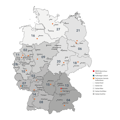 Mit unseren 20 Vertriebsstützpunkten innerhalb von Deutschland finden Sie Ihren persönlichen DEHN-Außendienstmitarbeiter ganz in Ihrer Nähe.