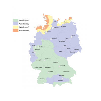 Deutschland ist in vier Windzonen mit unterschiedlichen Grundwindgeschwindigkeiten unterteilt. Die Grundwindgeschwindigkeiten sind wie folgt untergliedert: